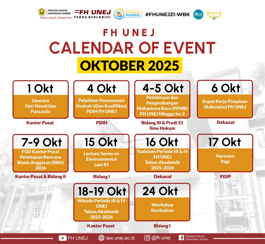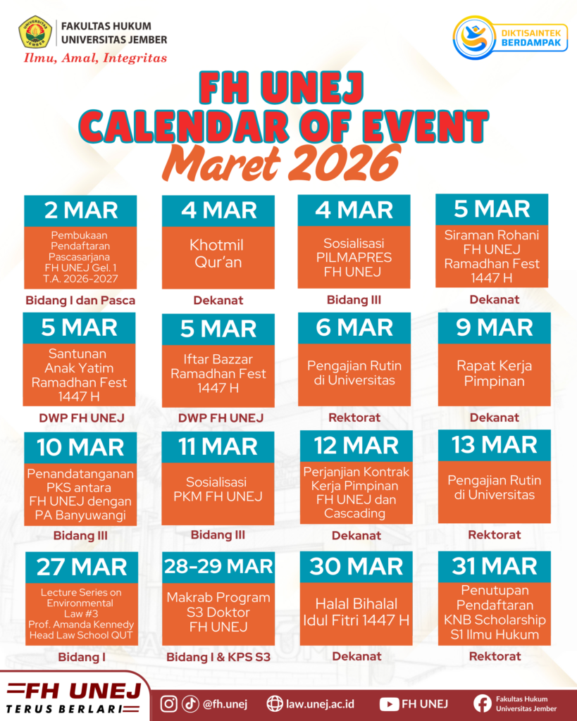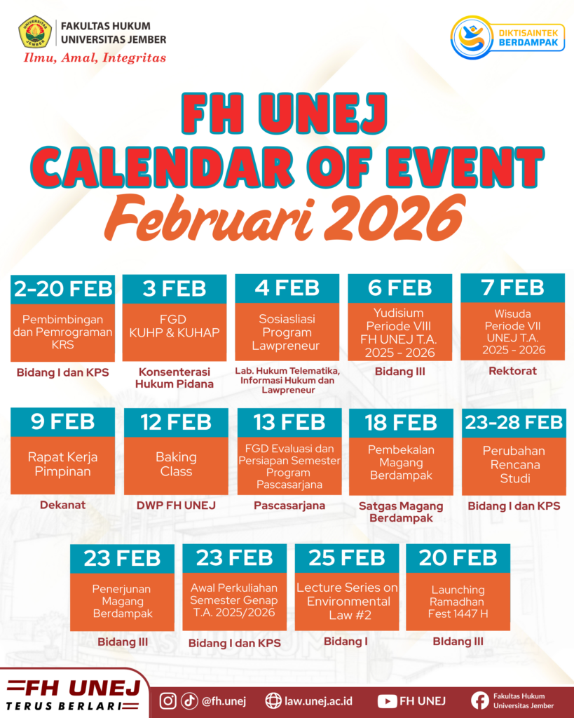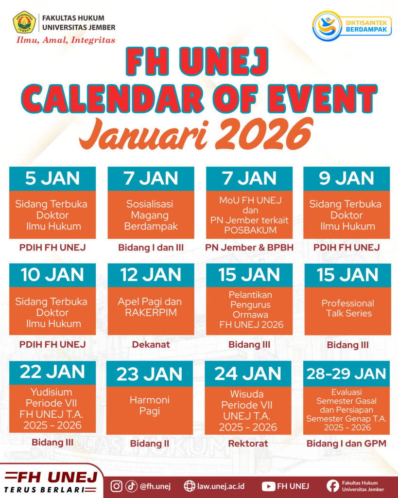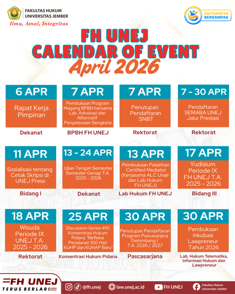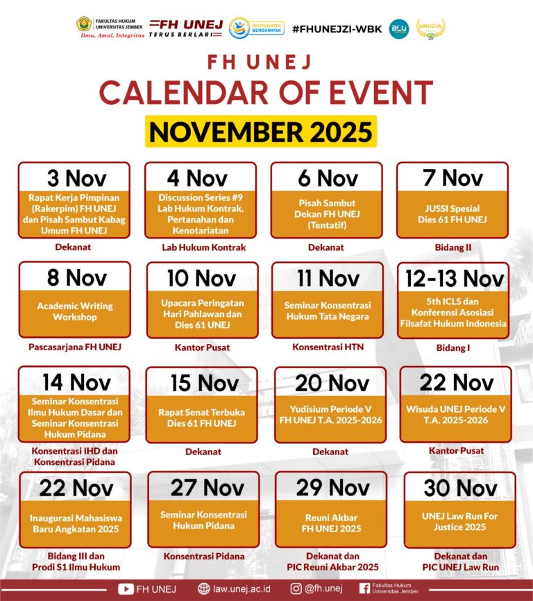 UNEJ Faculty of Law encourages the production of lasting and innovative research in legal studies and publishes in journals. To date, it hosts 9 open-access peer-reviewed journals, which consist of 2 international journals and 7 national journals.