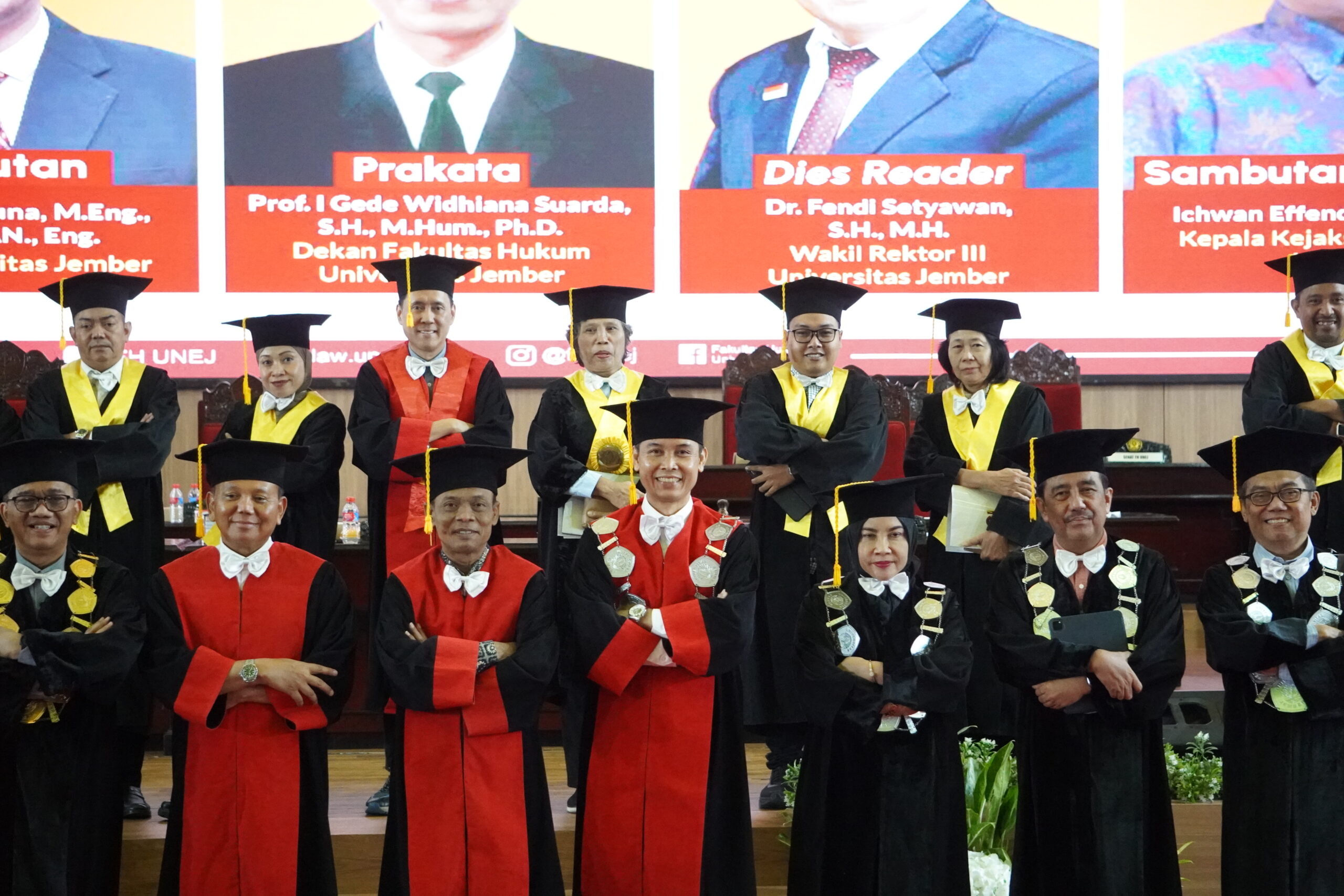Ia juga menyoroti tantangan perguruan tinggi di era percepatan digitalisasi, perkembangan kecerdasan buatan, serta dinamika hukum di sektor ekonomi dan tata kelola publik. Menurutnya, FH UNEJ harus terus memperkuat mutu Tridharma perguruan tinggi, meningkatkan tata kelola berbasis digital, serta membuka ruang internasionalisasi menuju target besar sebagai World Class Law School pada 2035.